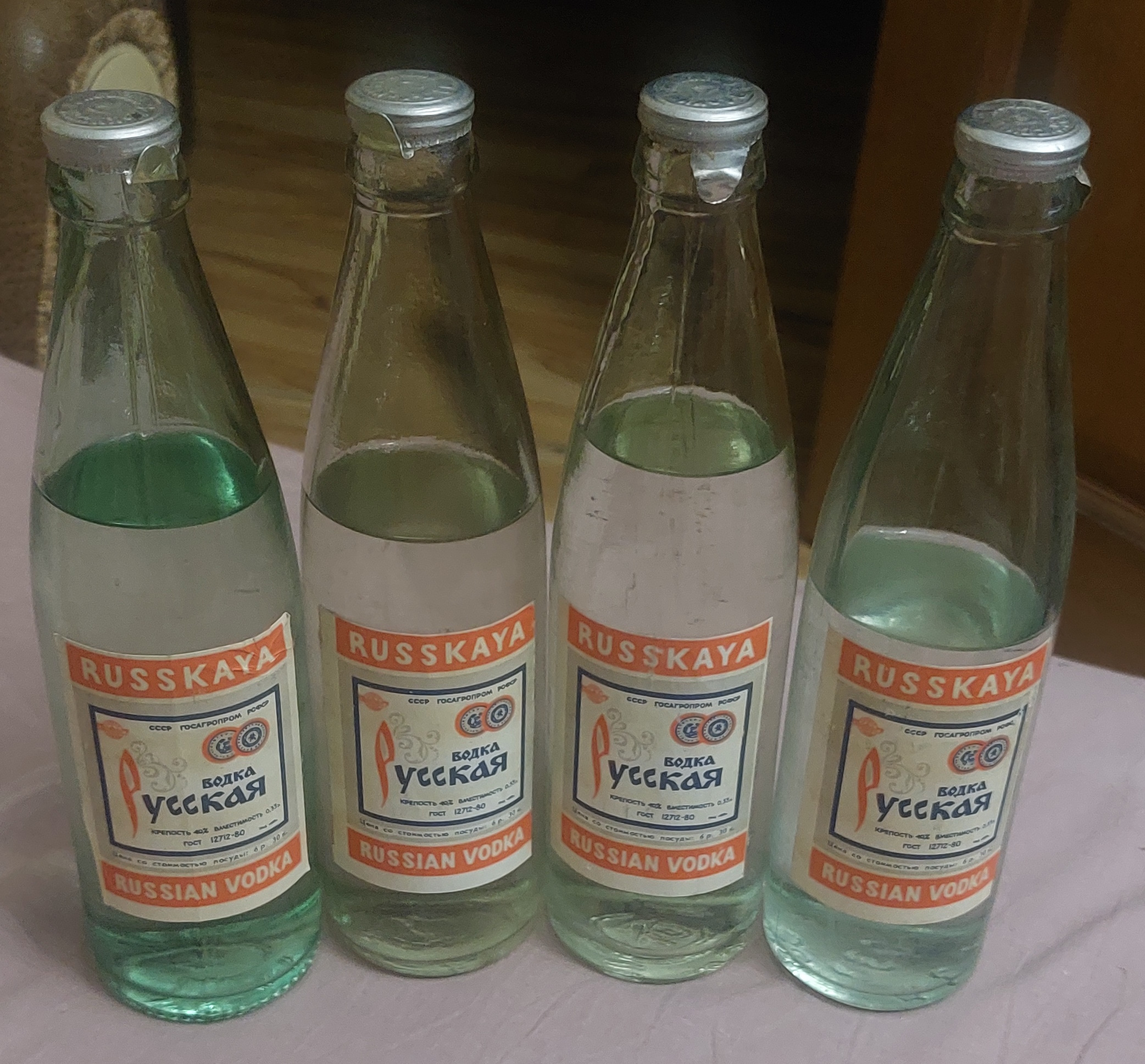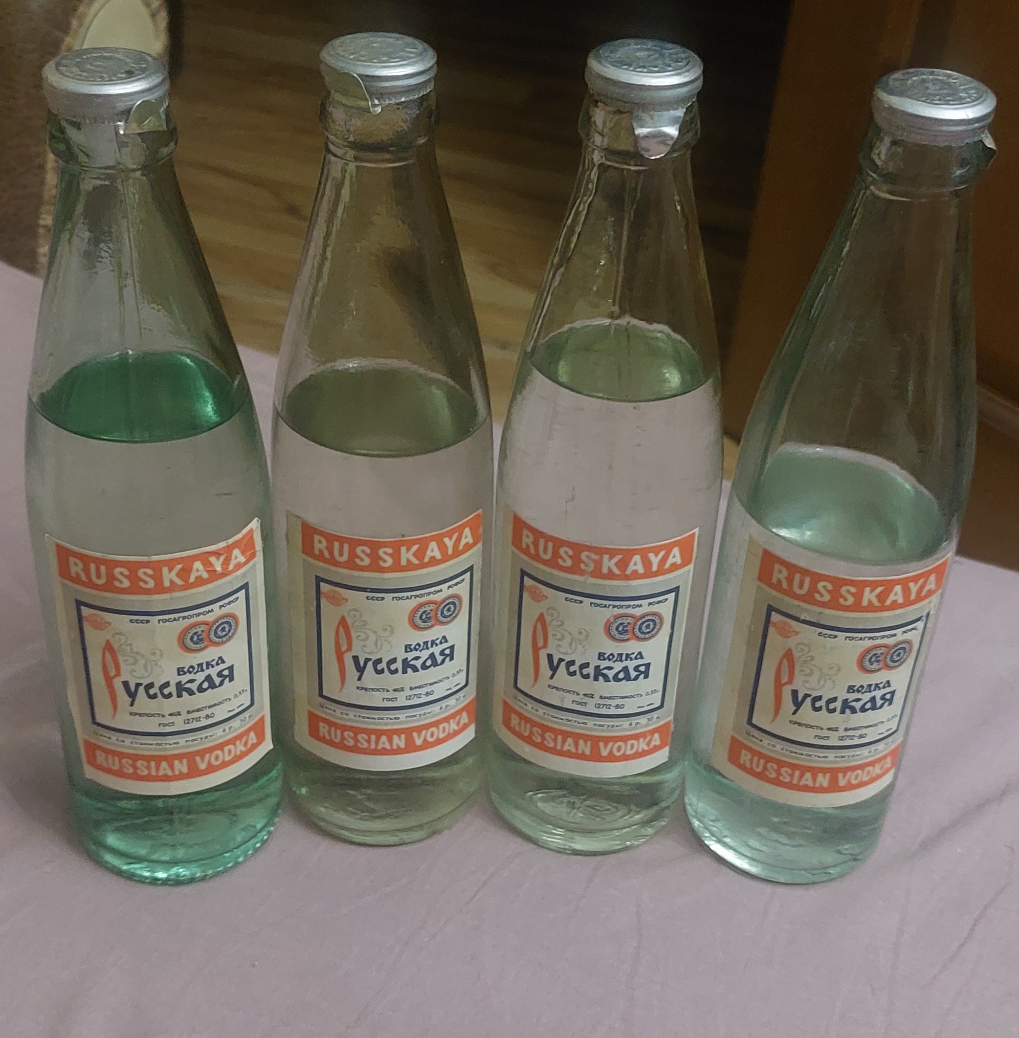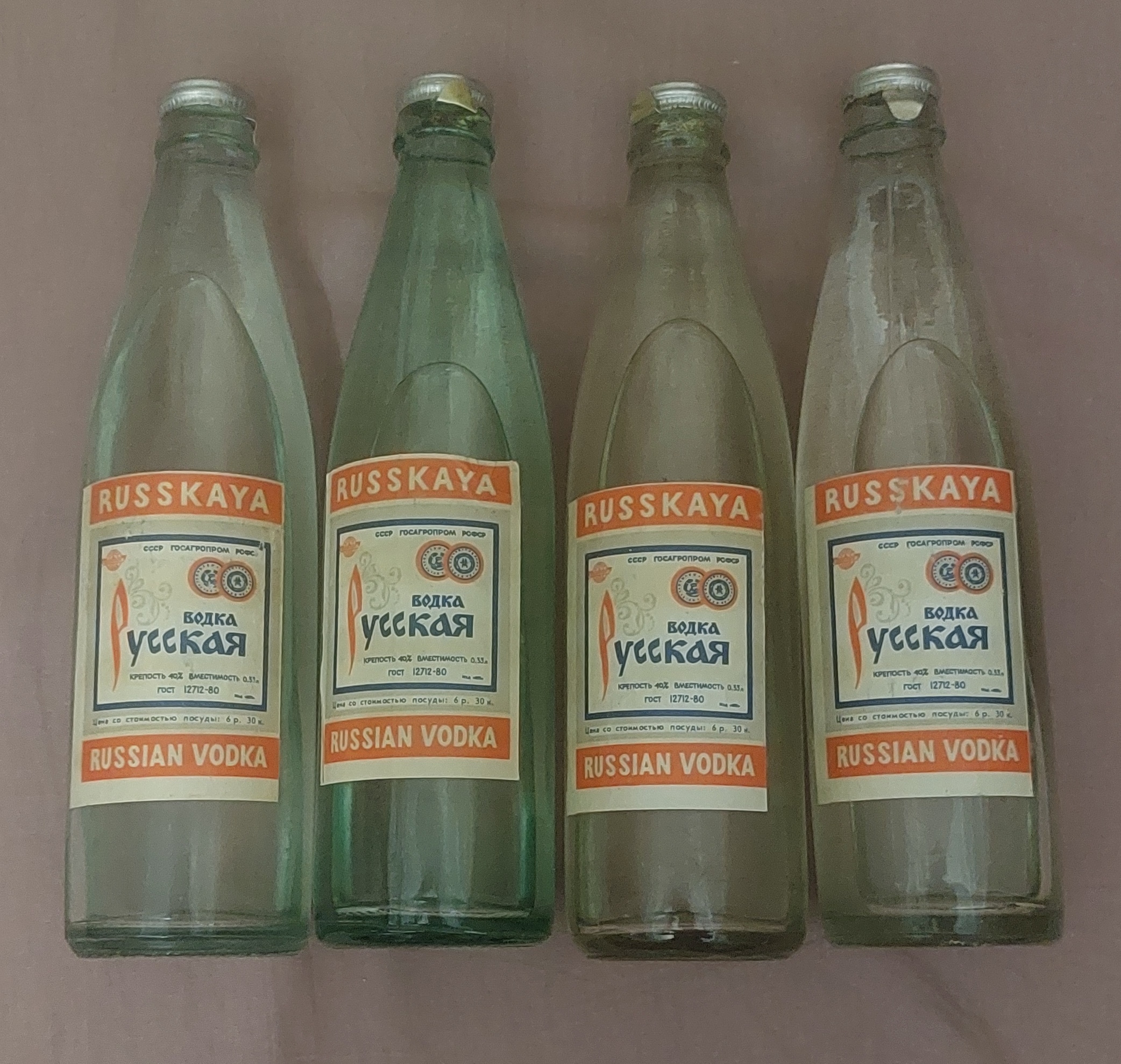 Продам 4 бутылки Водка Русская, цена 6 руб. 30 коп. Все бутылки из запасов старого человека, горлышко под "бескозырку", частично прошло "испарение" от времени, гарантированный оригинал. Есть на других площадках, где хорошая репутация.